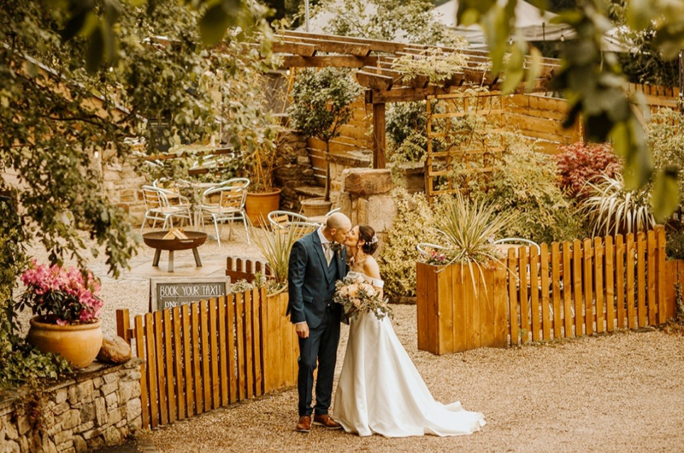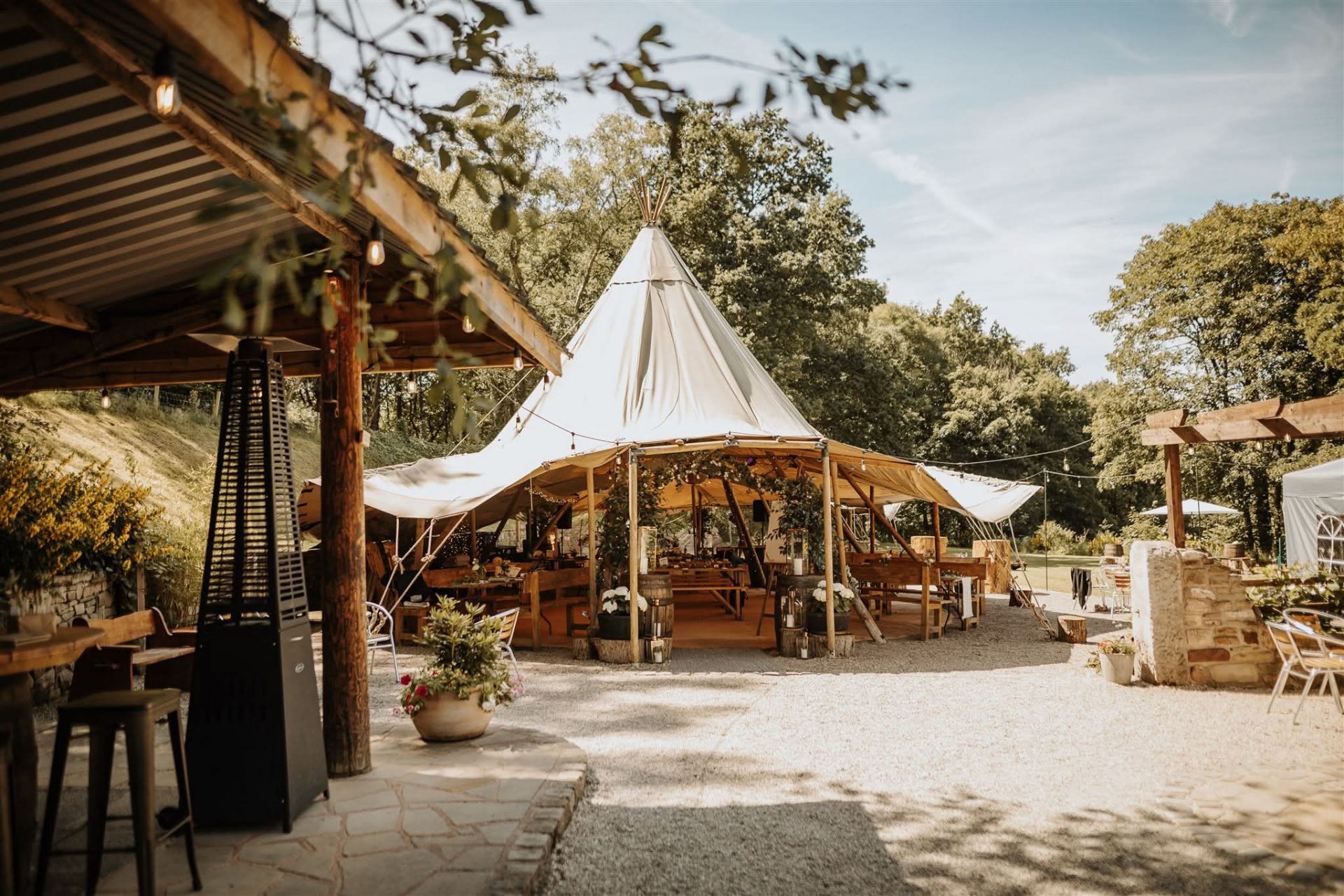 Following your ceremony you will make your way back to the tipis, meadow and bar area via the woodland path and over the handbuilt wooden bridge. The party begins with hugs, kisses and congratulations as we pour you and your guests a welcome drink. The rustic ‘Woodshed Bar’ is fully staffed and fully loaded with all local draught beer, cider, fine wine, crisp prosecco, shots, spirits and cocktails! We can work with you to supply drinks tokens or you can put money behind the bar if you want your guests to have drinks on you. The stone walls, pergola and plants in the ‘old ruin’ have a Mediterranean vibe whilst the fire pit and festoon lighting create the perfect evening ambiance.