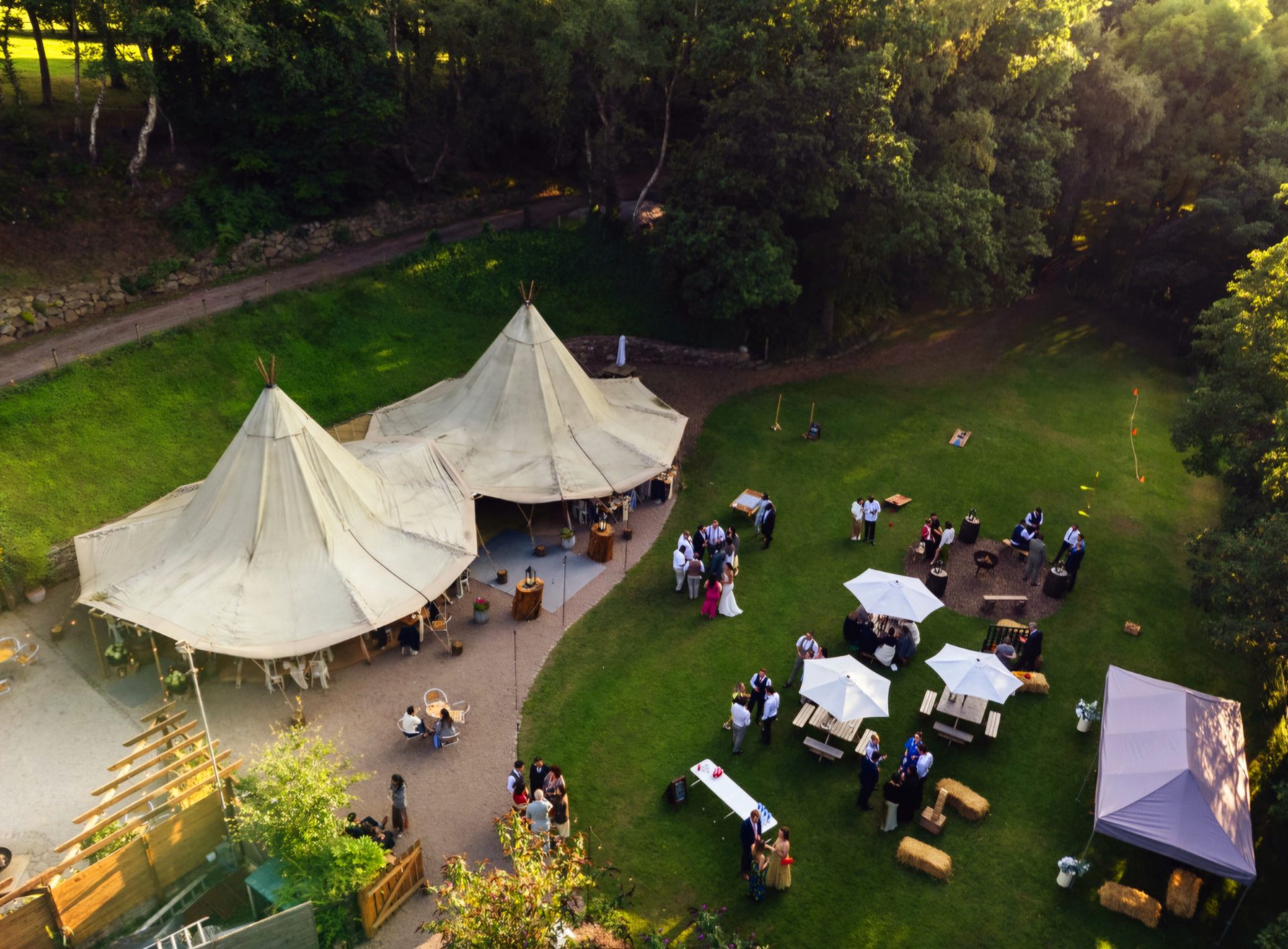 The large meadow around the tipis is fully enclosed, safe for children and perfect for entertaining your guests. We can supply a great selection of lawn games, a bouncy castle, toys and haybales around the firepit. You may want to hire other entertainment, we have had photobooths, crazy golf, magicians and festival glitter stations. A favourite with our couples is the Parkgate Grand National hobby horse race or for a full day of fun the Parkgate Olympics will entertain guests of all ages! The possibilities are endless and we will help you make your wedding day dreams become a reality!